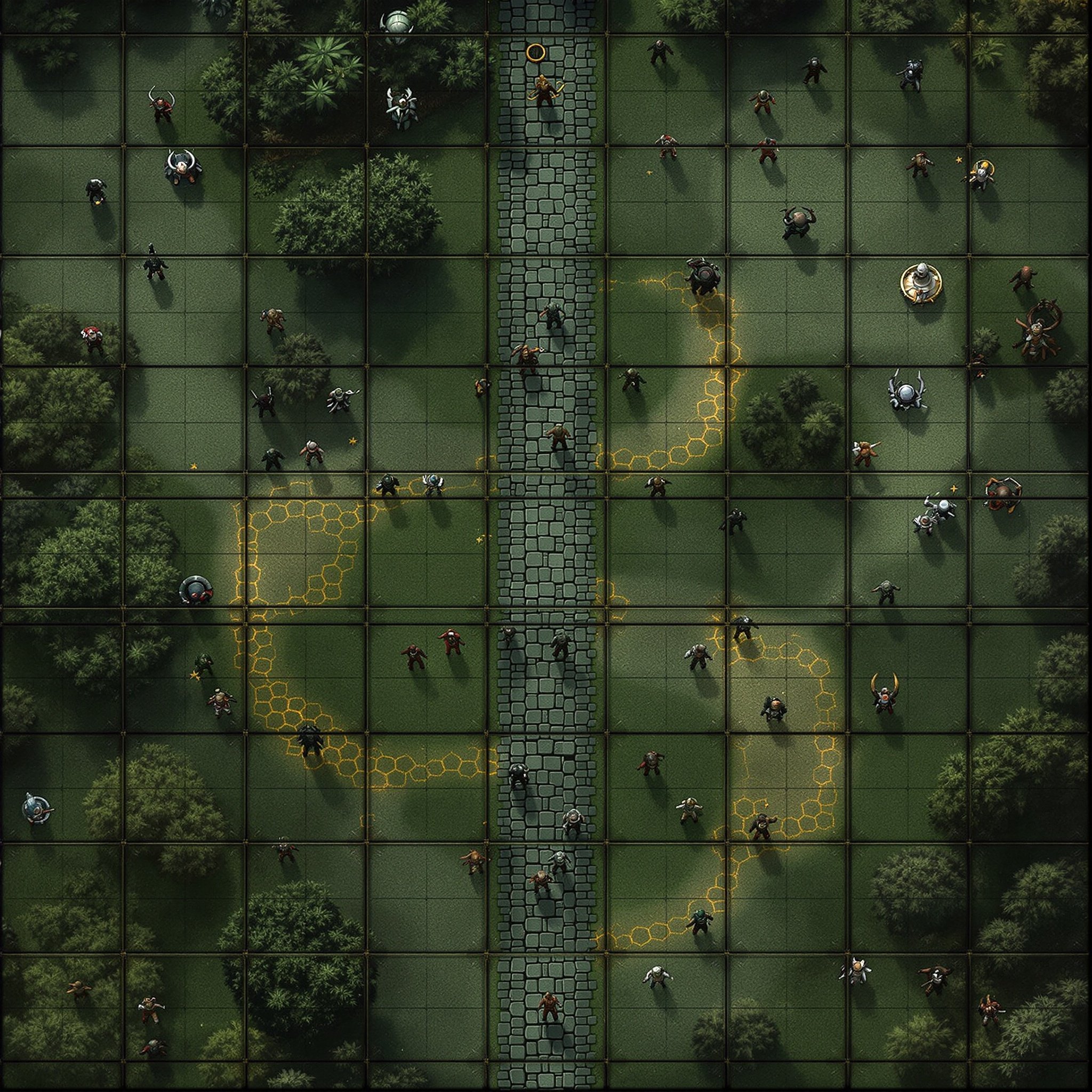 Each battlefield is uniquely generated with randomized terrain features. The danger level determines what percentage of the grid contains hazardous or strategic terrain tiles.